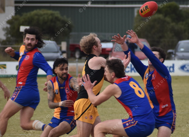 United’s Andrew McWhirter handballs over his Eagles opponents. (492473)