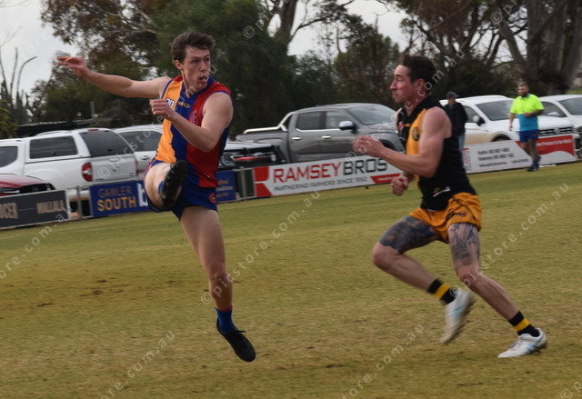 Hummocks-Watchman Eagles’ Mitchell Jude kicks the ball down the wing as Cory Sharer closes in. (492473)