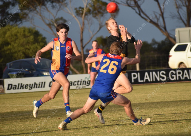 United captain Bailey Jones handballs over the head of Brodie Hocking. (492473)