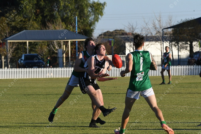 Ram Jacob Wotton can’t stop this mark by Magpie Sam Clements. (481819)