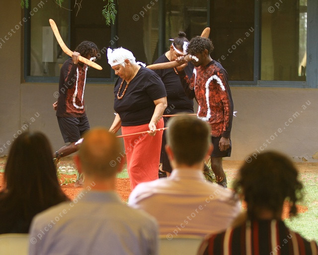 TRADITIONAL: Arrente dancers perform a traditional display for guests at the opening of the Apmere Mwerre expansion. (PIC: PHIL WILLIAMS 517198_01)