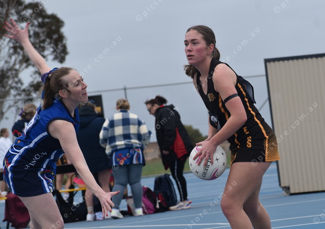 Long Plains’ Brooke McArdle tries to get the ball into the circle but Hummocks’ Caitlyn Heaslip stands in her way. (492474)