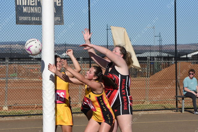 Angle Vale’s Athena Lyberopoulos attempts to keep the ball in play around the goal post, with Charlotte Branson trying to grab the rebound. (Lisa Schulz: 477410)