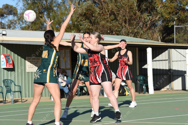 Hamley Bridge’s Rachael Burgess flicks a pass to a teammate with Balaklava’s Georgina Lampard applying great pressure. (494111)