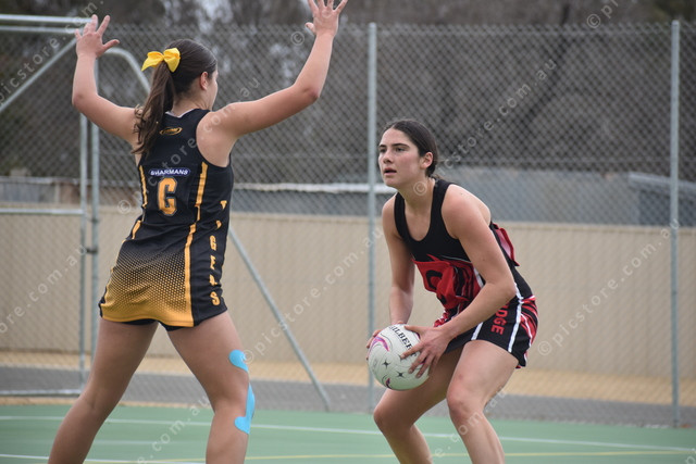 Hamley Bridge’s Jessica Hawker looks to get past Long Plains’ Holly Sobey. (491029)