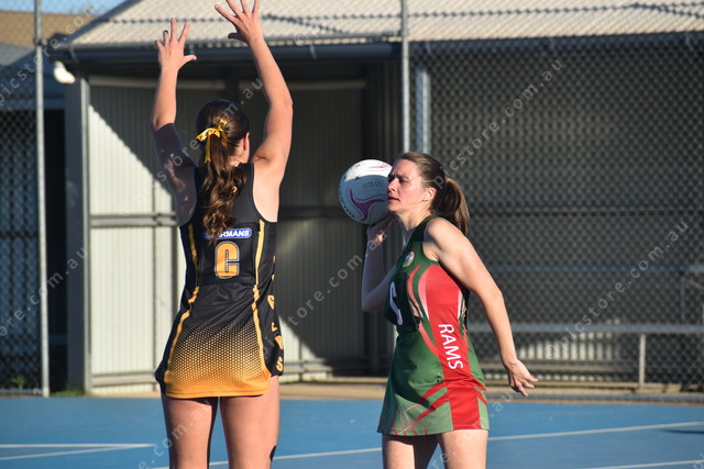 Virginia’s Shae Trask with the centre pass as Holly Sobey defends. (498136)