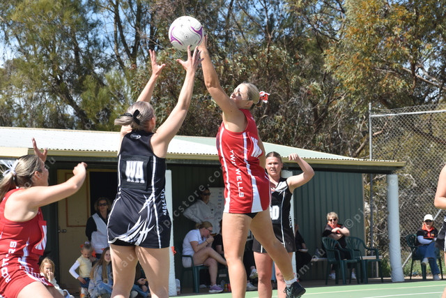 Mallala’s Tori Doherty about to catch the ball, which went past the hands of Two Wells’ Cristie Castle. (503284)