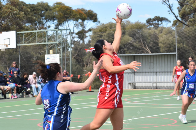 Two Wells GK Dana Oxenham intercepts the ball ahead of Hummocks’ Chloe Hoepner. (503284)