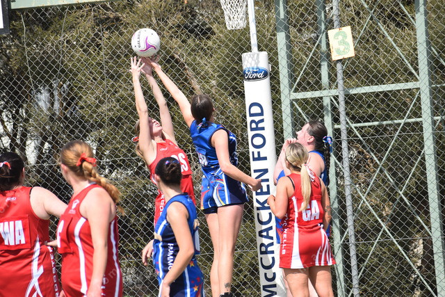 Hummocks’ Karli Andrew about to win the rebound against Two Wells’ Jessica Penfold. (503284)