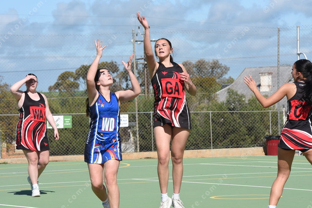 Hummocks’ Kyla Zazzaro is ready to receive but is overcome by Hamley Bridge’s Mahli Mundoon in 17 & under. (Lisa Schulz: 498420)