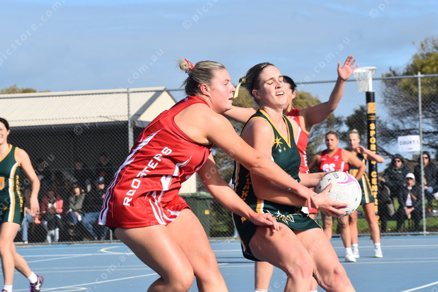 Balaklava’s Allyce Fatchen secures the ball against Two Wells’ Maddison Thomson. (499746)