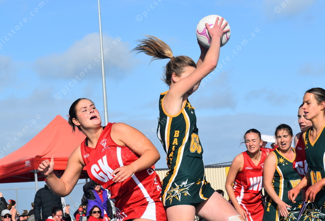 Balaklava’s Laura Daniel claims the ball in front of Two Wells’ Charli Thomson. (499746)