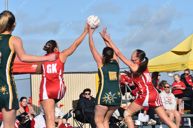 Two Wells’ Charli Thomson deflects the ball out of the hands of Balaklava’s Lauren Ruiz, who was also up against Acacia Hryhorec. (499746)