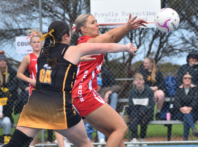Two Wells’ Cristie Castle about to secure the ball against Long Plains’ Jorja Schutt. (499746)