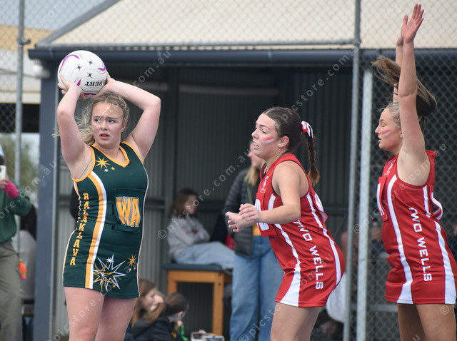 Balaklava’s Kyla Kinbacher with the ball, up against Two Wells’ Tennille Dudley and Charlotte Stauwer-Smith. (499746)