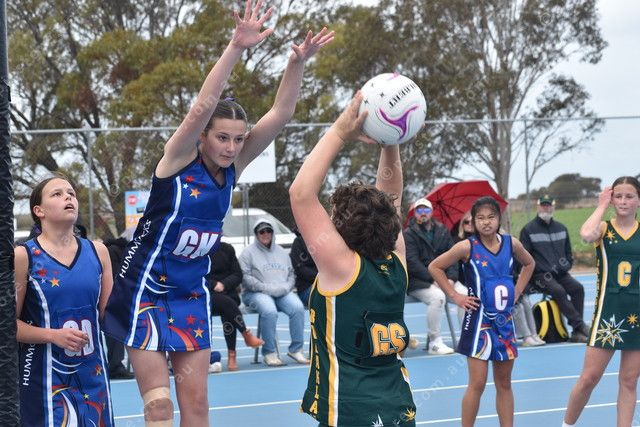 Balaklava’s Rykan White shoots for goal as Hummocks’ Darcy Stopp looms over. (499746)