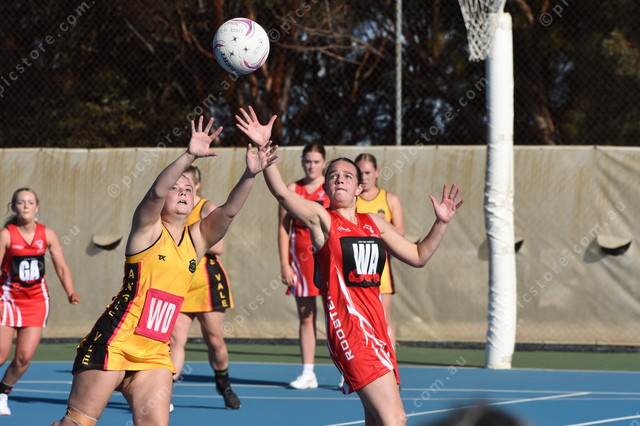 Angle Vale’s Aleesha Chaffey and Two Wells’ Ellie Bell both ready for the ball. (Lisa Schulz: 474749)