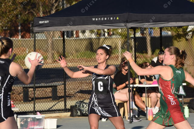 Holly Castley feeds into the Mallala goal circle, despite the defensive efforts of Virginia’s Brielle White. (481975)