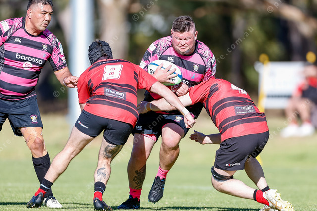Dan Crosby crashes into a pair of tacklers with Nick Frost in support. (472227_03)