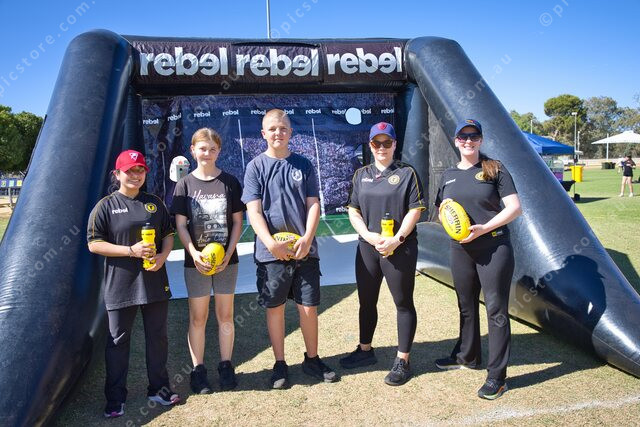 Akrita Singh, Brooklyn Ratcliffe, Jacob Bobbin, Vanessa Harvey and Hannah Gill have a shot at the Gawler Footy Frenzy’s Rebel Sports setup. (471851_18)