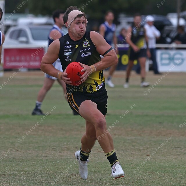 Nuriootpa midfielder Brad Hoepner came back out in the second half with a serious tape job after getting busted open in the second quarter. (474736_03)