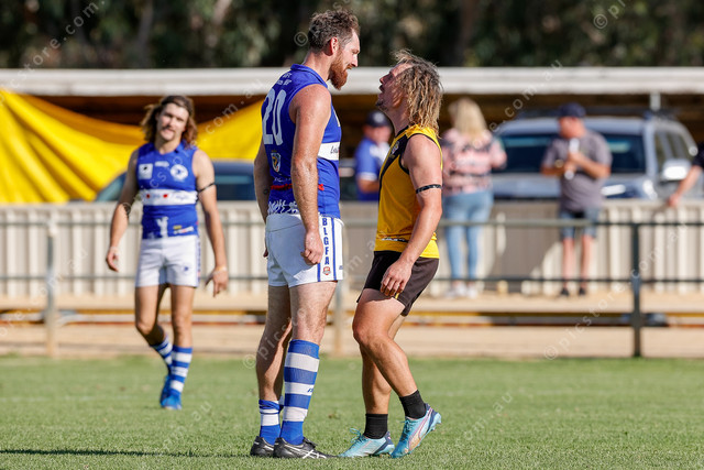 Gawler Central’s Kyle Wurst stands up to South Gawler big man Chris James. (474771_03)