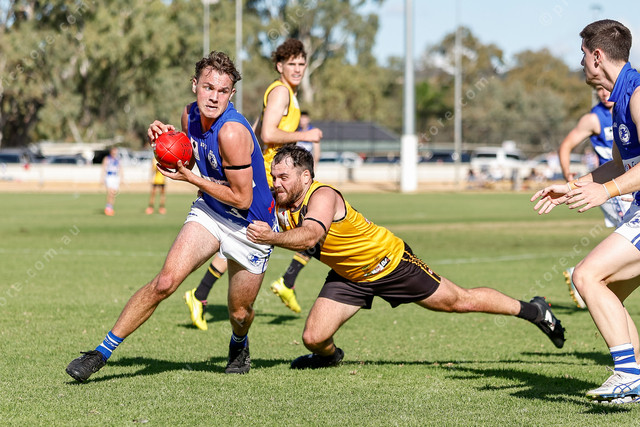South Gawler’s Bailey Blacker shakes off the attempted tackle from Tyson Friend. (474771_06)