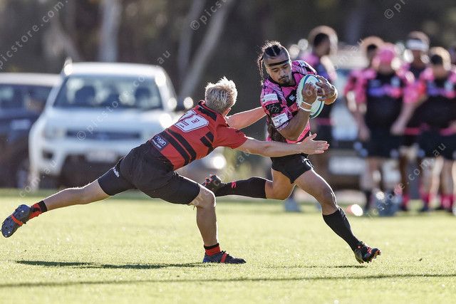 Barossa’s winger slips a tackle and darts down the sideline in front of the Rams bench. (474801_05)