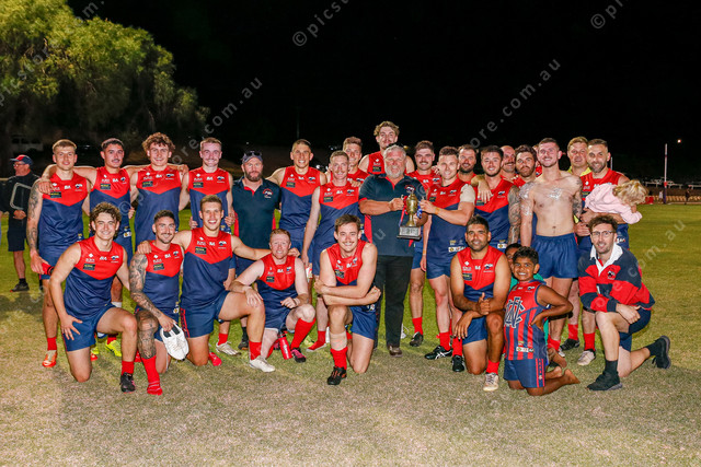 Willaston’s reigning A grade premiers celebrate their Round 1 victory at home under lights. (Mark Willoughby: 470719_01)