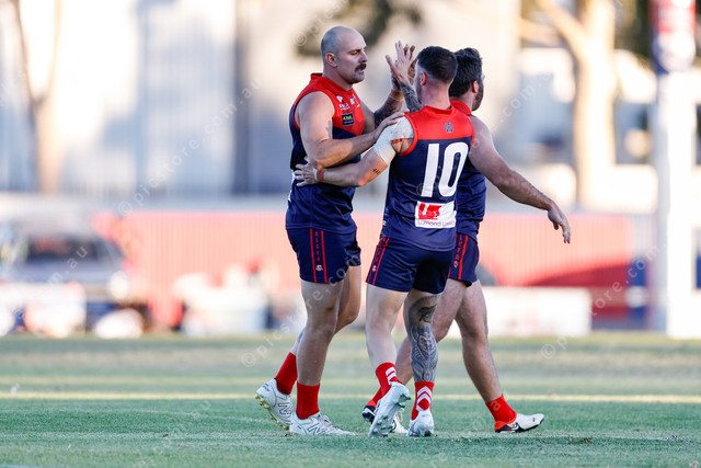 Josh Waldhuter is congratulated after one of his four goals. (470719_04)