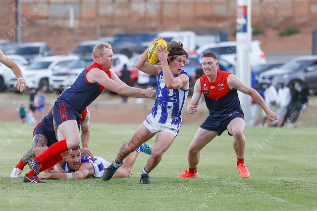 South Gawler’s Flynn Pisani tries to evade the tackles from Ash Fry and Deakin Davis. (470719_07)