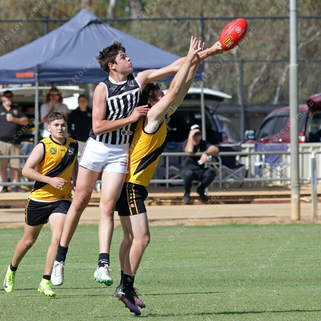 Tanunda’s Noah Schulz uses his long arms to produce a perfect spoil over the back of Jack Starr. (Michael Slattery: 470483_01)