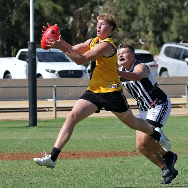 Henry Roeger gets some separation from Magpies defender Anthony Bombardieri and marks on the lead. (470483_02)