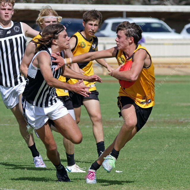 Gawler Central’s Lachlan Hall tries to push away the incoming tackle from Nash Reilly. (470483_05)