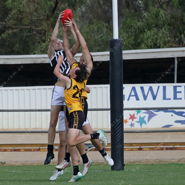 Towering Tanunda forward hangs onto a heavily contested mark above Boyd Sandery and Mason Dohnt. (470483_10)