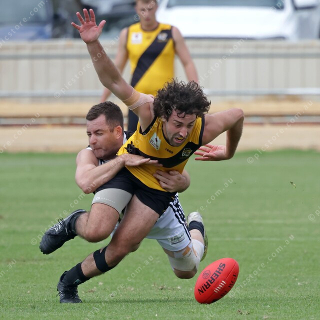 Tanunda’s Ryan Bignell tackles Sam Dowden as he tries to draw the free kick. (470360_03)