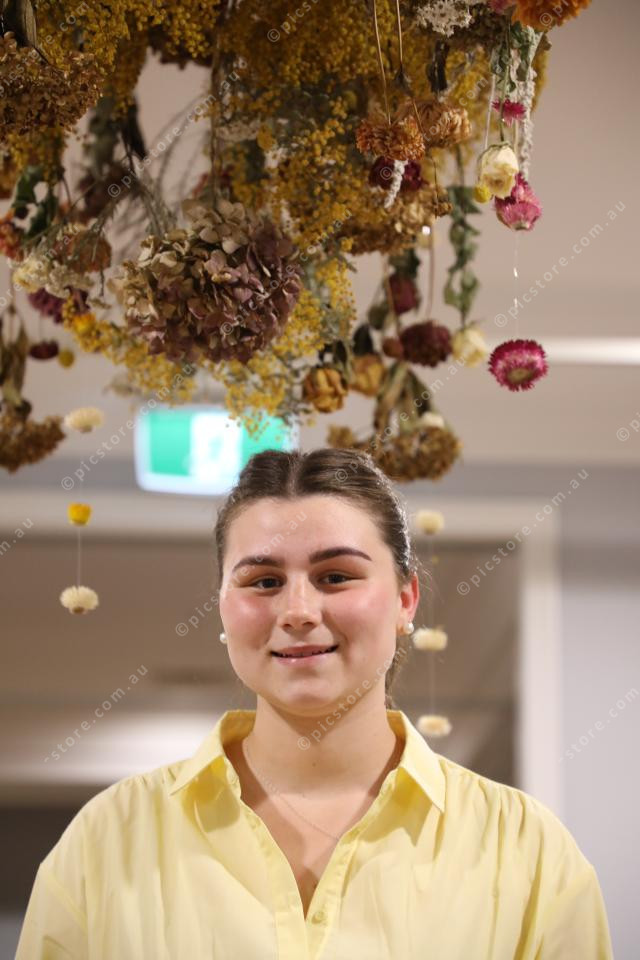 Standing under her art work display called Petals of the Past, Nani Blanchett, 17 VCE Monivae College