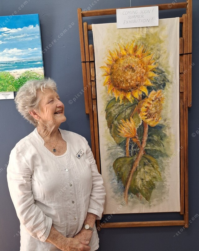 Gallery member Althea Holmes, with one of her deck chair art pieces.