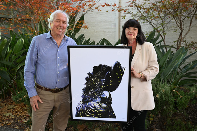 Pic of committee chair of Bacchus Marsh Rotary Peter Shilton and secretary Donna Martin holding artwork. Photo by Damjan Janevski. 478007_05