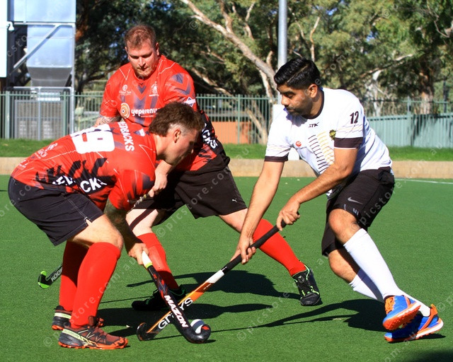 BLOCK: Todd Casperson and Jesse Bevilacqua making a blocking defence to stop Kuldeep Sran’s advance. (PIC: PHIL WILLIAMS 479968_06)