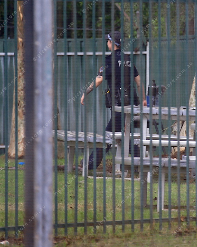 BACKYARD: A police officer in the back yard of a South Terrace hostel following the stabbing of a woman. (PIC: PHIL WILLIAMS 535534_02)