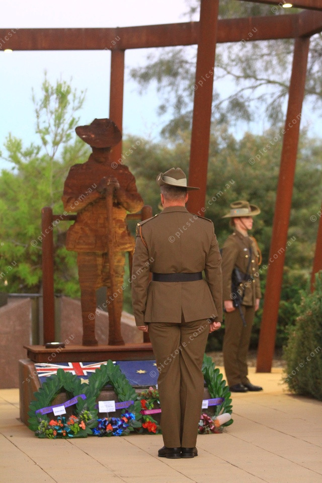 WREATHS: A soldier observes the newly laid wreaths during the Dawn Service. (PIC: PHIL WILLIAMS 474167_06)