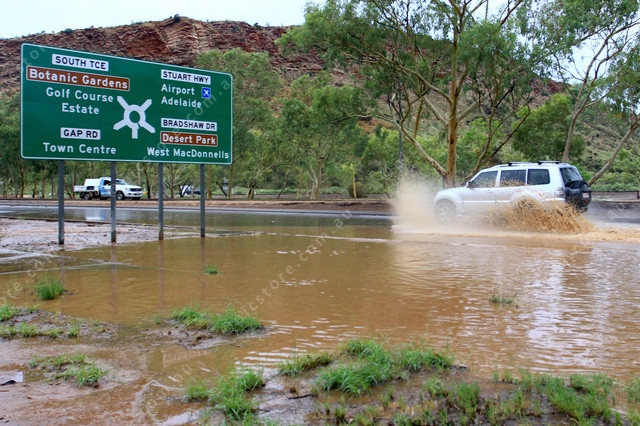 SPLASH: A driver splashes their way through water on the Stuart Highway at Tom Brown roundabout. (PIC: PHIL WILLIAMS 534725_07)