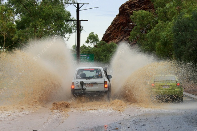 SWAMPED: A 4WD swamps a Commodore as both vehicles make their way through water near the Tom Brown roundabout. (PIC: PHIL WILLIAMS 534725_13)