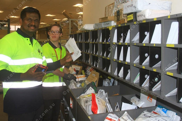 Varun Gobinadhan and Ted Duffell sorting letters for the more than 3000 people who don’t have fixed addresses who use the Alice Springs Post Offic. (PIC: PHIL WILLIAMS 504197_10)