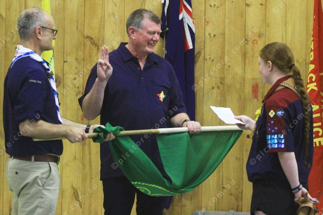 OATH: Paul Rumpff takes the Scout oath as he is invested as a Group Leader by the Australia’s top scout, Brendan Watson. (PIC: PHIL WILLIAMS 519980_04)