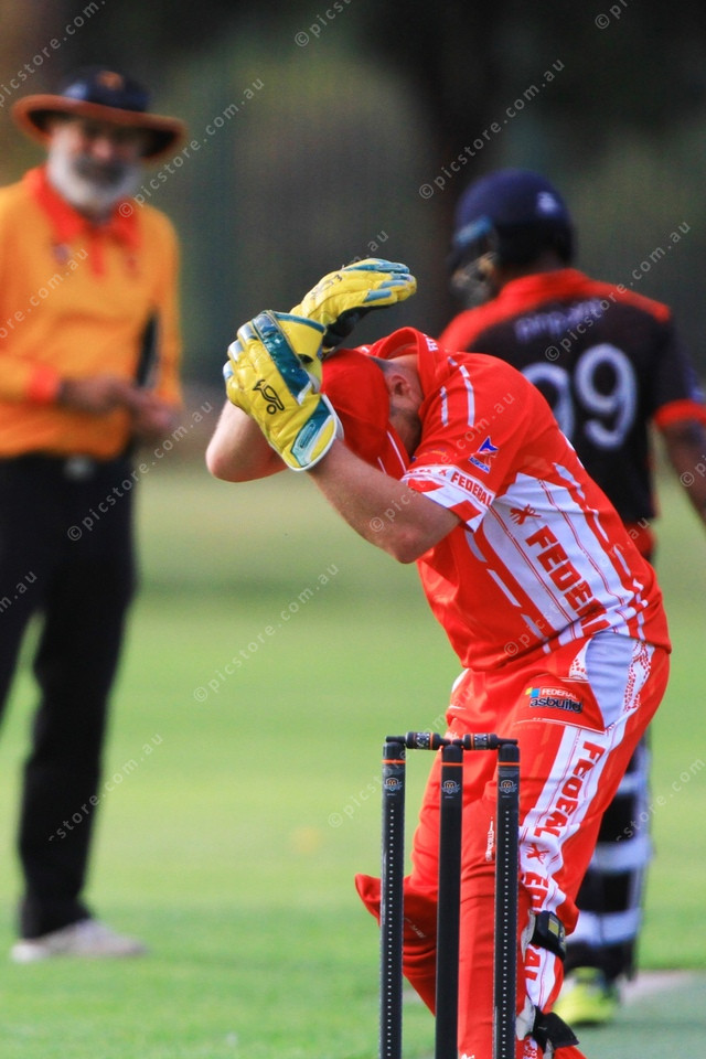 PROTECT: Oscar Ball takes cover after losing sight of the ball in the sun (PIC: PHIL WILLIAMS 467269_03)