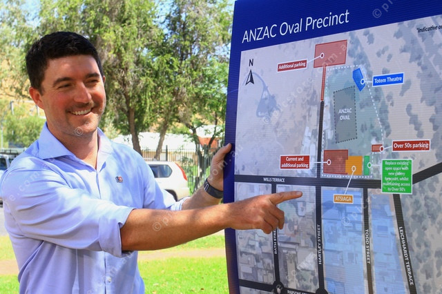 PLAN: Minister Josh Burgoyne points out aspects of the ANZAC Oval Masterplan. (PIC: PHIL WILLIAMS 445603_04