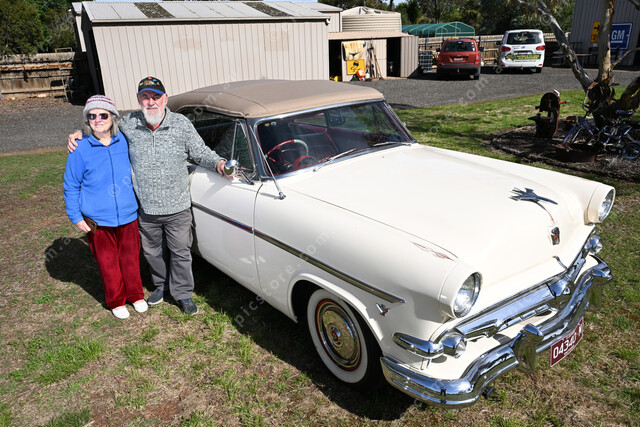 Ray Jones is auctioning motoring memorabilia and workshop equipment. Pic is Ray and his wife Gaye with a Ford Crestline which is going under the hammer. (Damjan Janevski). 516401_02