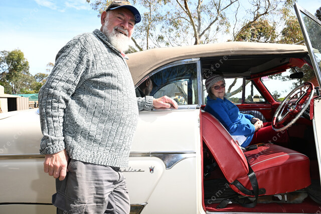 Ray Jones is auctioning motoring memorabilia and workshop equipment. Pic is Ray and his wife Gaye with a Ford Crestline which is going under the hammer. (Damjan Janevski). 516401_06